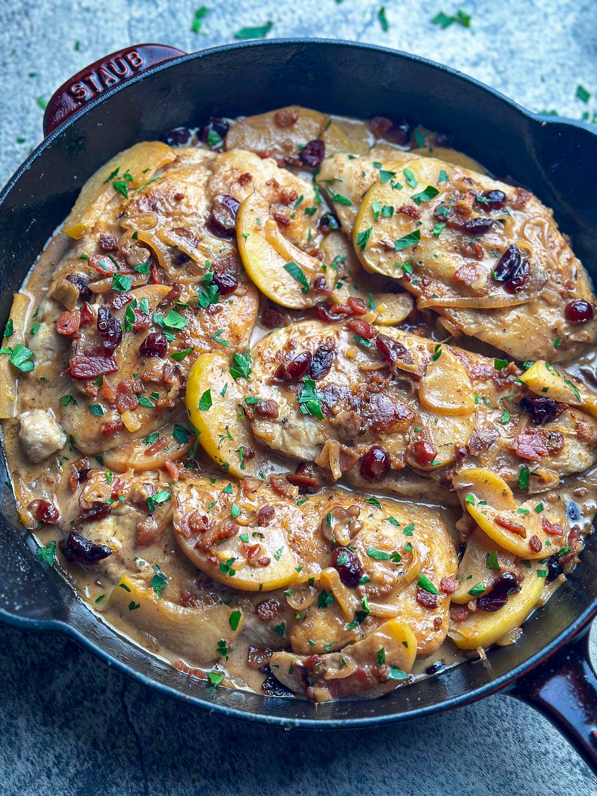 Creamy Cider Chicken with Apples, Cranberries, and Bacon - Juicy chicken simmered in a creamy apple cider sauce with tart cranberries and crispy bacon — comfort food at its finest.