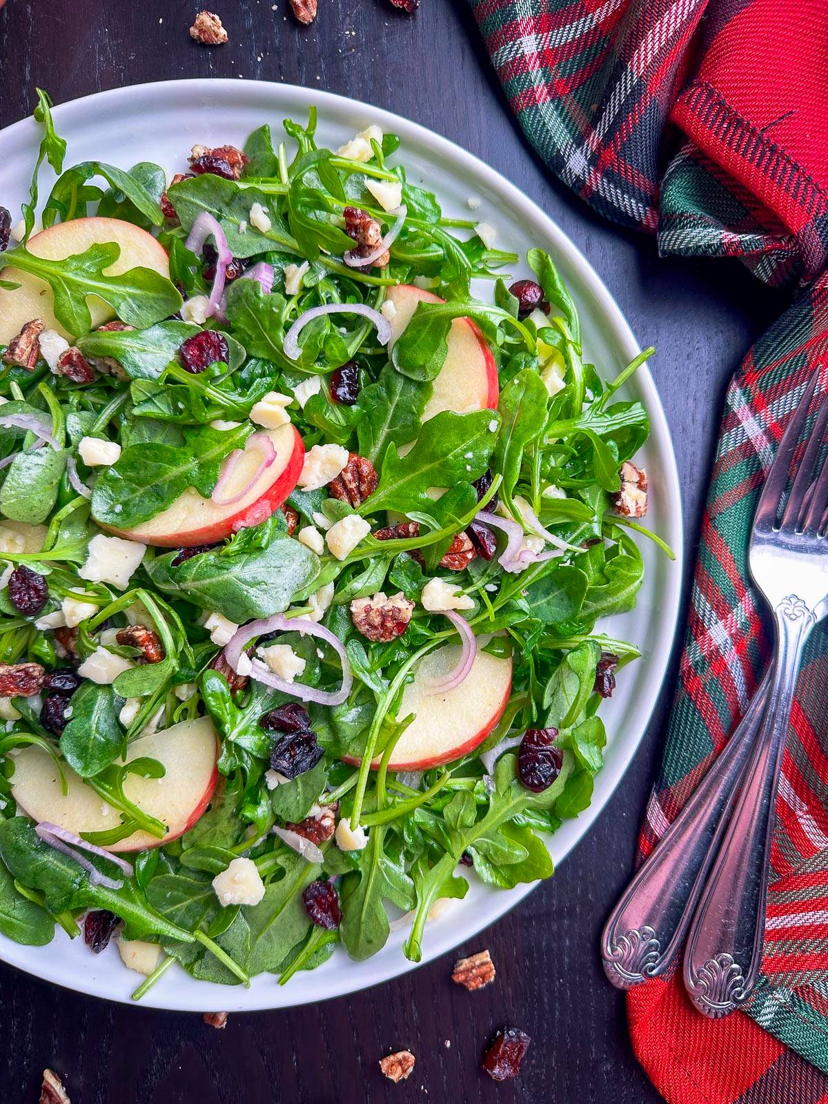 Apple Arugula Salad with Cheddar and Pecans - Peppery arugula meets sharp aged cheddar, crisp apples, and toasted pecans in this fresh, vibrant salad that pairs beautifully with roasted meats.