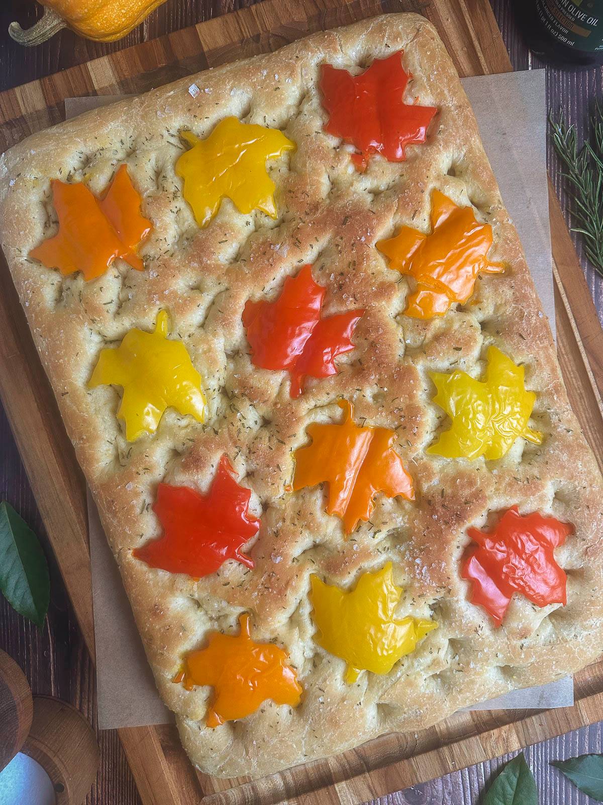 Fall Focaccia with Bell Pepper Maple Leaves - A total showstopper on a potluck spread.